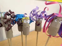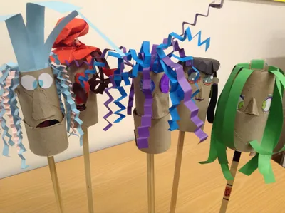 KS2 after school Art Club have created some characterful puppets with moving mouth mechanisms. They started out life as a toilet roll inner, but were transformed with magnificent hairdos and fine features, and the best part is that you can play with them. Can you spot the scary vampire?